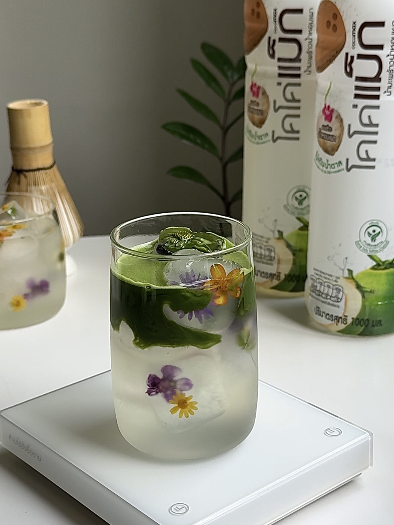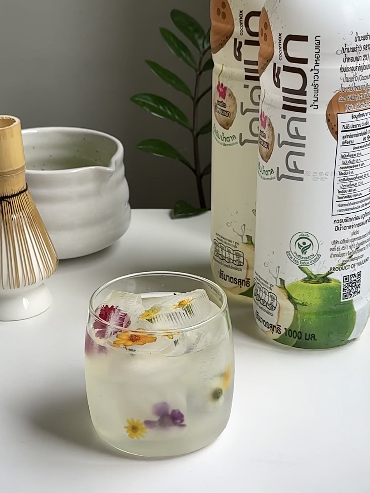 - น้ำแข็งดอกไม้ทานได้ (น้ำแข็งจาก โคโค่แม็กน้ำมะพร้าวน้ำหอมเผา ตกแต่งด้วย edible flowers)