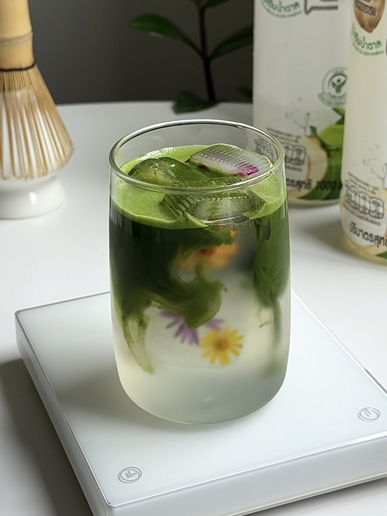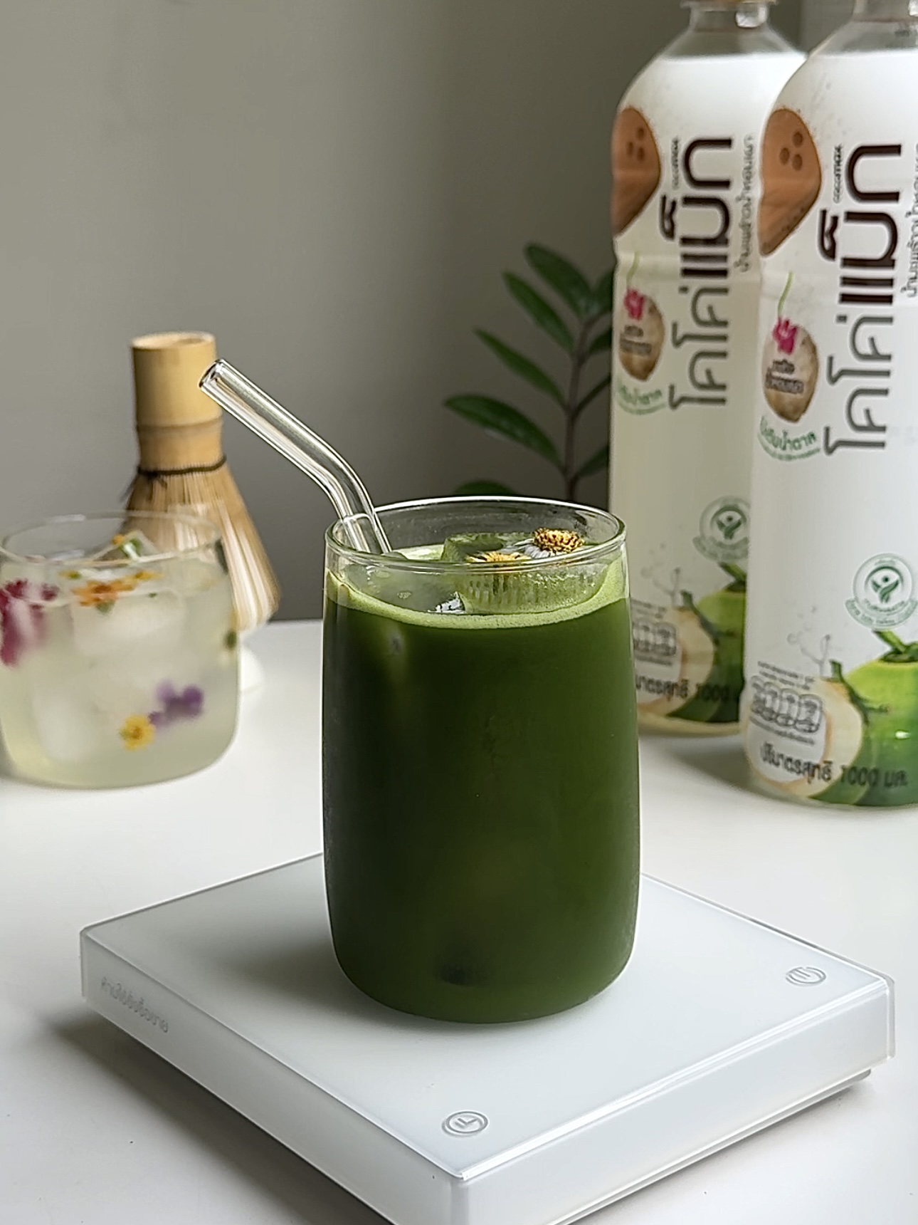 - เทมัทฉะที่ตีเสร็จแล้วออนท็อป พร้อมเสิร์ฟ